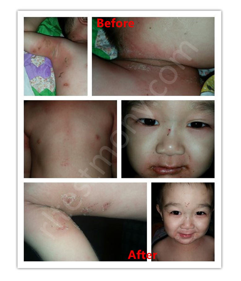 Ini anak bongsu saya Eden, kami mendapati ketiak kanannya terdapat 3 bintik merah pada 31/5/2016, tetapi tidak memberi perhatian. Tidak sangka selepas 3 hari, bahagian tekak, mulut dan telinganya mula merah, bengkak dan gatal, gatal sehingga dia tidak dapat tidur dan memakai baju, dan juga mesti buka penghawa dingin! Pada malam tersebut, saya banyak menyemburkan H+ untuk dia dan sapukan Hydro untuk mengelakkan kulit retak, juga memberikan dia Mediterranean Gold untuk diambil.